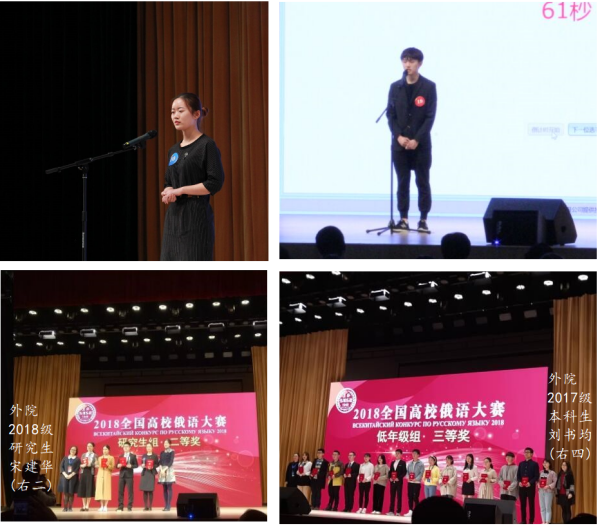 近日,我院2018级硕士研究生宋建同学、2017级本科生刘书均同学在“2018全国高校俄语大赛”中,经过初赛、复赛和决赛,在笔试、演讲、表述等项目中表现优异,再创佳绩,分别获得大赛二等奖和三等奖,并获得国家留学基金委全额资90助赴俄学习的资格,将于来年赴俄罗斯高校进修一年。 2018年是中俄地方合作交流年,也是“一带一路“倡议进入的第五年。“全国高校俄语大赛”作为中俄两国人文合作领域框架内机制化项目,由教育部国际合作与交流司主办,于2018年10月26~28日在上海外国语大学虹口校区成功举行。包括北京大学、北京外国语大学、上海外国语大学等在内的全国147所高校遴选出349名本科生、研究生参赛,可谓高手云集。选手们尽展才华,角逐低年级组、高年级组、研究生组三个组别60个名次的奖项,获奖同学将由国家留学基金管理委员会秘书处全额资助赴俄罗斯进修或攻读学位。我院刘书均获得三等奖,而宋建同学获得二等奖,这是一次新的突破。 自2008年起至今,该项赛事已成功举办11届,我院有14人次在比赛中获奖,并得到国家留学基金委全额资助出国进修或攻读硕士研究生的机会。我院在此项赛事中所取得的成绩,受到许多兄弟院校的称许,为院校赢得了荣誉。