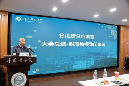 西南大学谢周教授致闭幕词。谢周教授高度评价了此次大会的学术成果,对主办方致以真诚的感谢,希望成语学研讨会越办越好,不断开辟成语研究新方向,发展成为成语研究的重要基地。