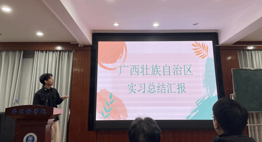 在实习小组汇报环节,17个实习小组进行了精彩的展示。他们分享了实习期间的所见所闻、所学所感,展示了英语系学子在实习岗位上的风采与收获。武汉经开一中小组成员分享了在实习过程中所做工作、实习学校提供的教育资源以及学到的教育技巧和沟通策略;广西省实习小组表示在实习过程中第一次真正地体会到教师工作的辛苦不易;湖南省长郡中学实习小组则着重分享了实习学校开展的英语教研活动,表示在活动中获益颇丰,积累了许多贴合新课标的创新教学的方法。