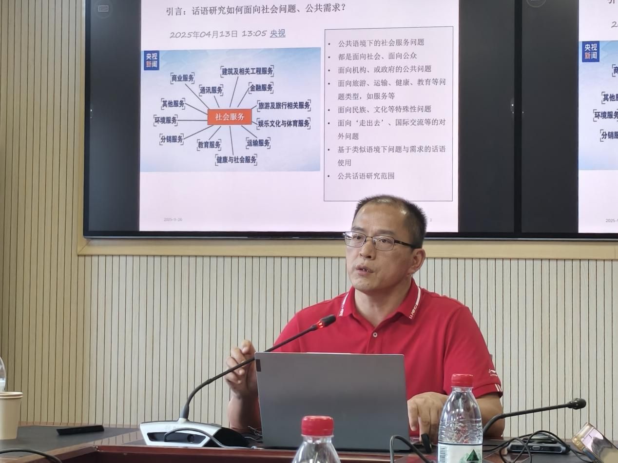 首场讲座由广东外语外贸大学冉永平教授主讲,主题为“面向社会问题的公共话语研究”。冉教授从语用学视角切入,系统阐述了公共话语的内涵、特征及其与社会现实问题的紧密关联。他结合丰富实例,深入剖析了公共话语研究的社会问题指向、核心议题与研究方法,强调了语言学者在新时代背景下应具备的社会责任感与研究担当。讲座逻辑清晰、见解独到,为理解语言在社会公共领域中的角色与功能提供了深刻启示。