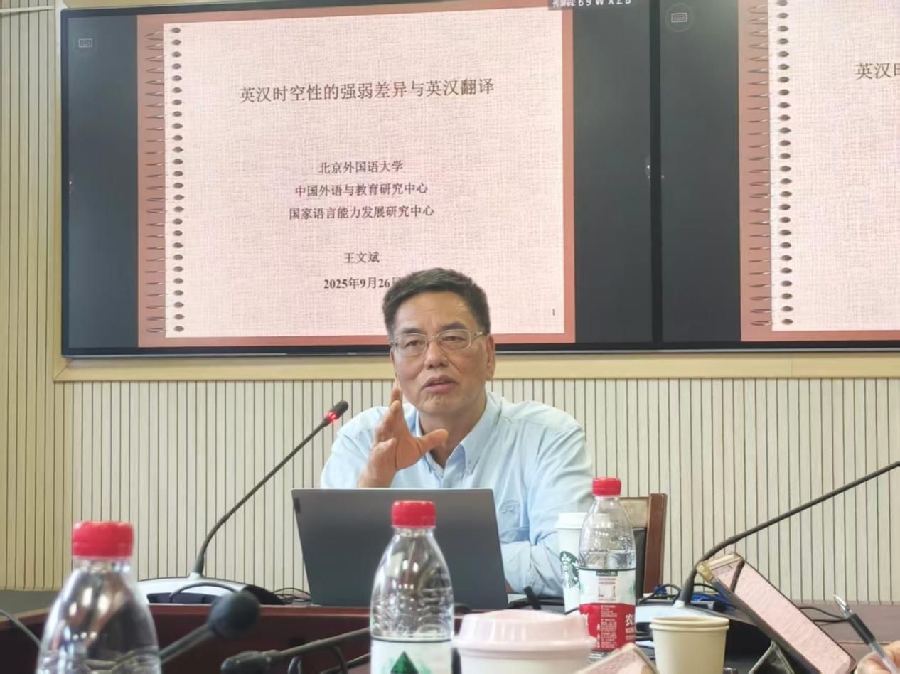 北京外国语大学王文斌教授带来了题为“英汉时空性的强弱差异与英汉翻译”的精彩讲座。王教授从语言本体论出发,系统论证了英语高度时间性的线性思维特征与汉语强空间性的立体块状思维模式。他通过大量生动的翻译实例,详细阐释了这两种特性在句法结构、篇章组织及修辞风格上的具体体现,并指出,准确把握英汉时空性差异是实现地道翻译、突破翻译瓶颈的关键所在。讲座内容深入浅出,理论联系实际,极大地启发了师生对语言本质与翻译实践的新思考。