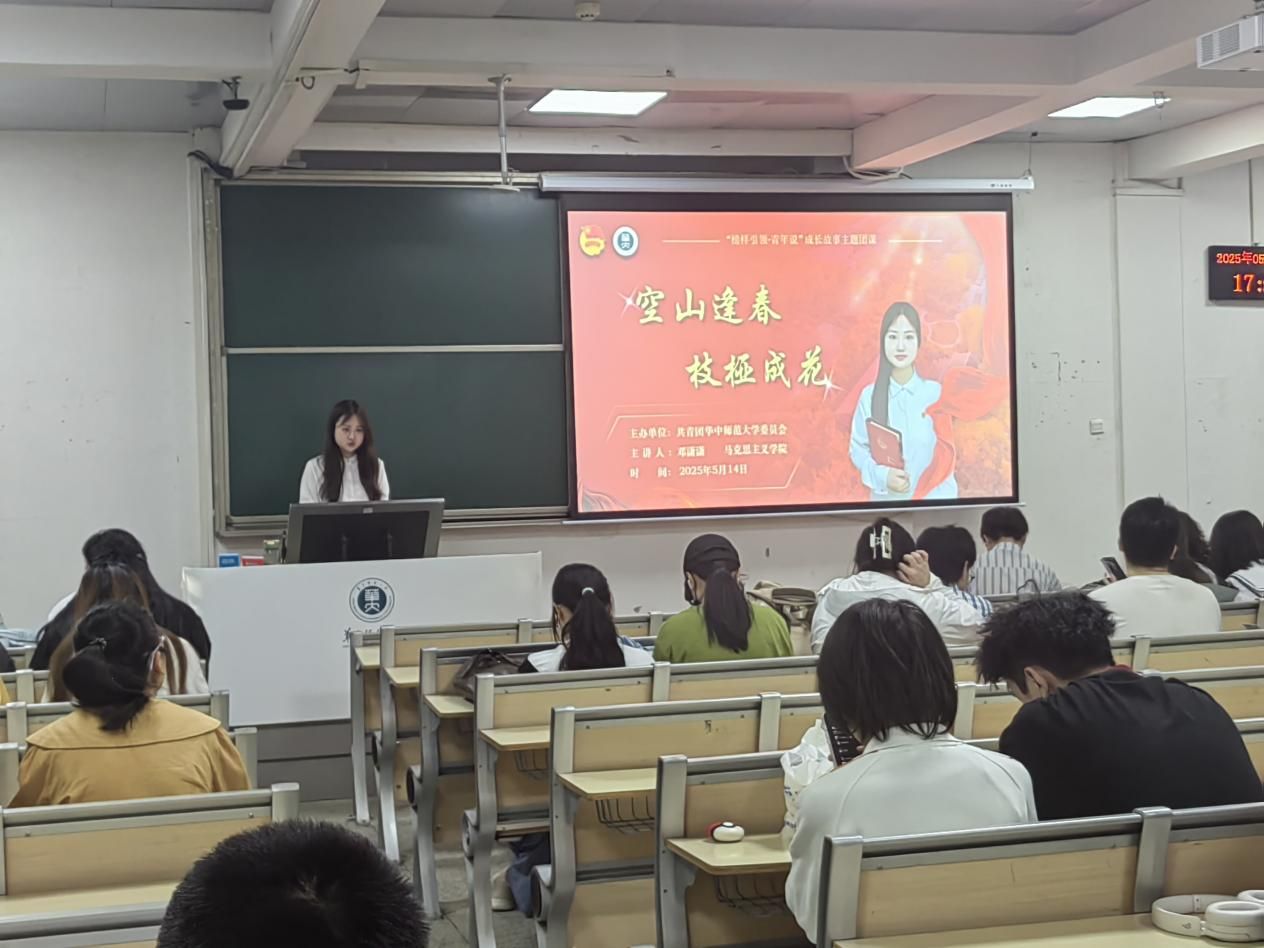 2021级英语(师范)专业本科生邬丽婷为2024级小语种青年学子讲授“胸怀理想,筑梦远航”主题团课。她以章开沅老校长题写的“语言大师,思想旗手,行动先锋”为主线,从思想淬炼、专业筑基、全球实践三个维度展开讲述。邬丽婷向大家分享作为第十四届MODEL APEC大会全国总冠军,受邀以中国青年代表身份参加APEC 工商领导人峰会的经历,生动诠释了外语人才在文明互鉴中的桥梁作用,强调“语言能力是新时代青年对话世界的通行证”,为外院青年学子指明了“扎根中国、放眼全球” 的成长路径。